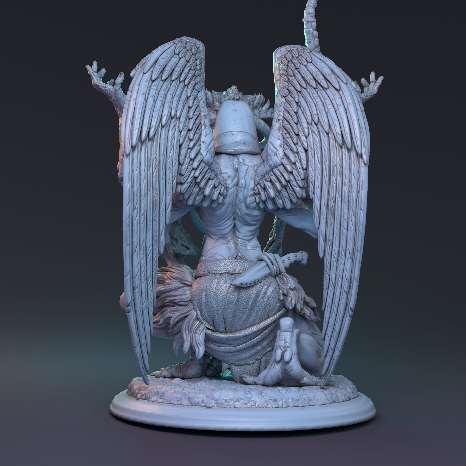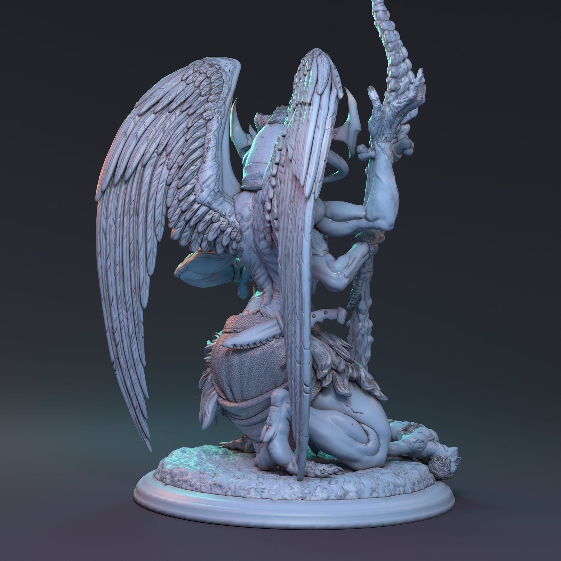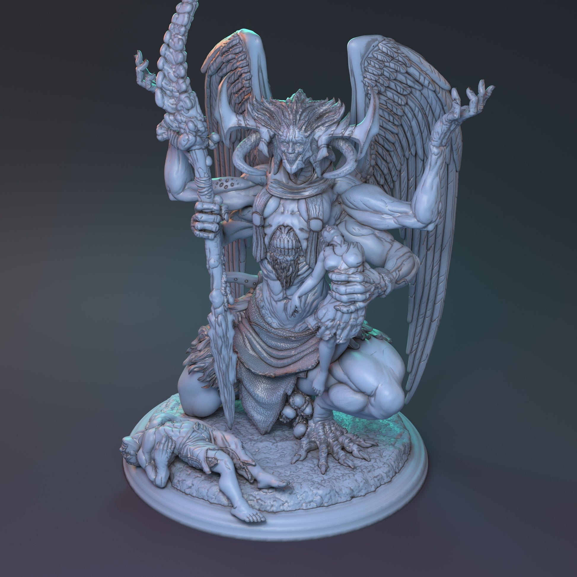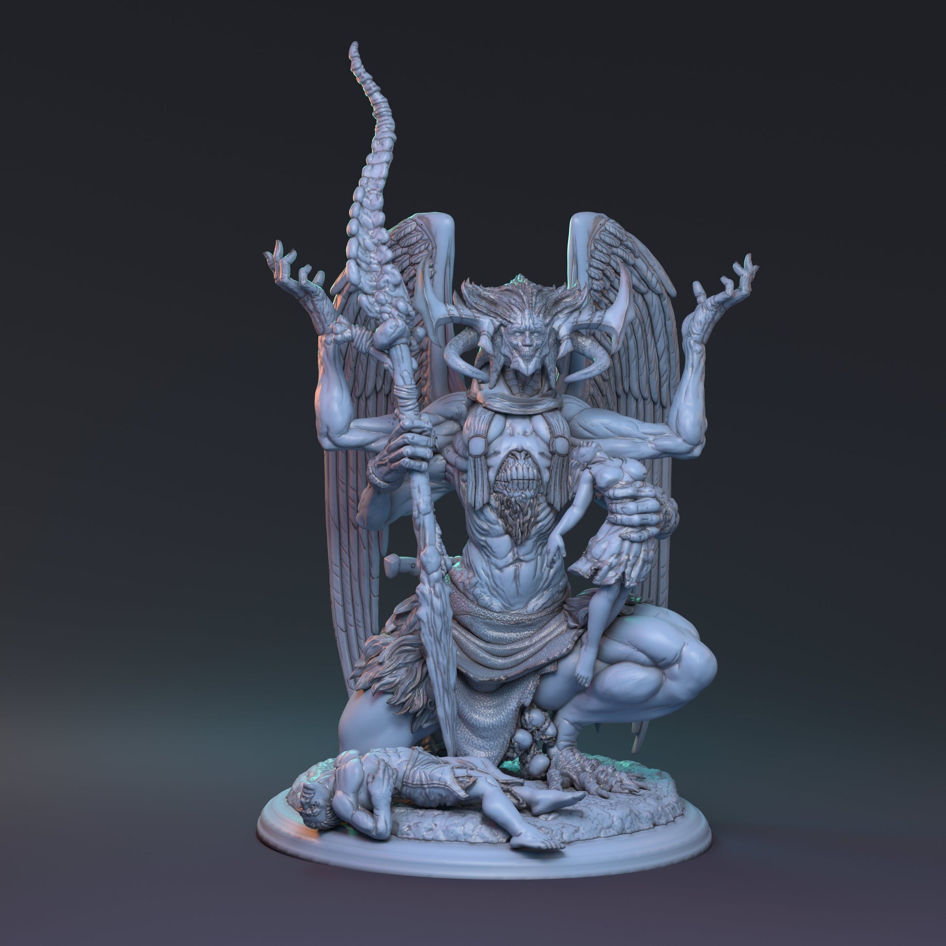 "Agveldis Mantum, the so called 'Judicar' of the ancient kingdom of Faycez-Morne, has loomed within these desiccated tomb-lands for centuries. She was once it's princess, famed for her beauty but when war came that would render the kingdom to ashes, a rite was performed that turned her into this demonic form she now holds. Exploring Faycez-Morne one may hear the wails of women captured by her which soon she devours, jealous of their human body and beauty."