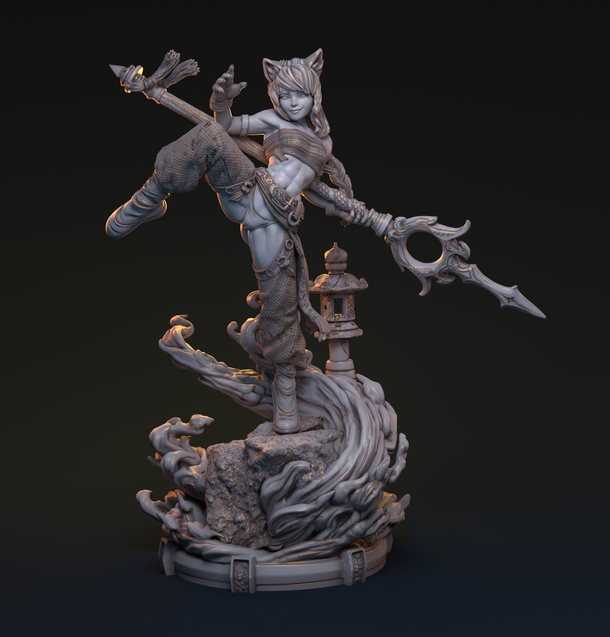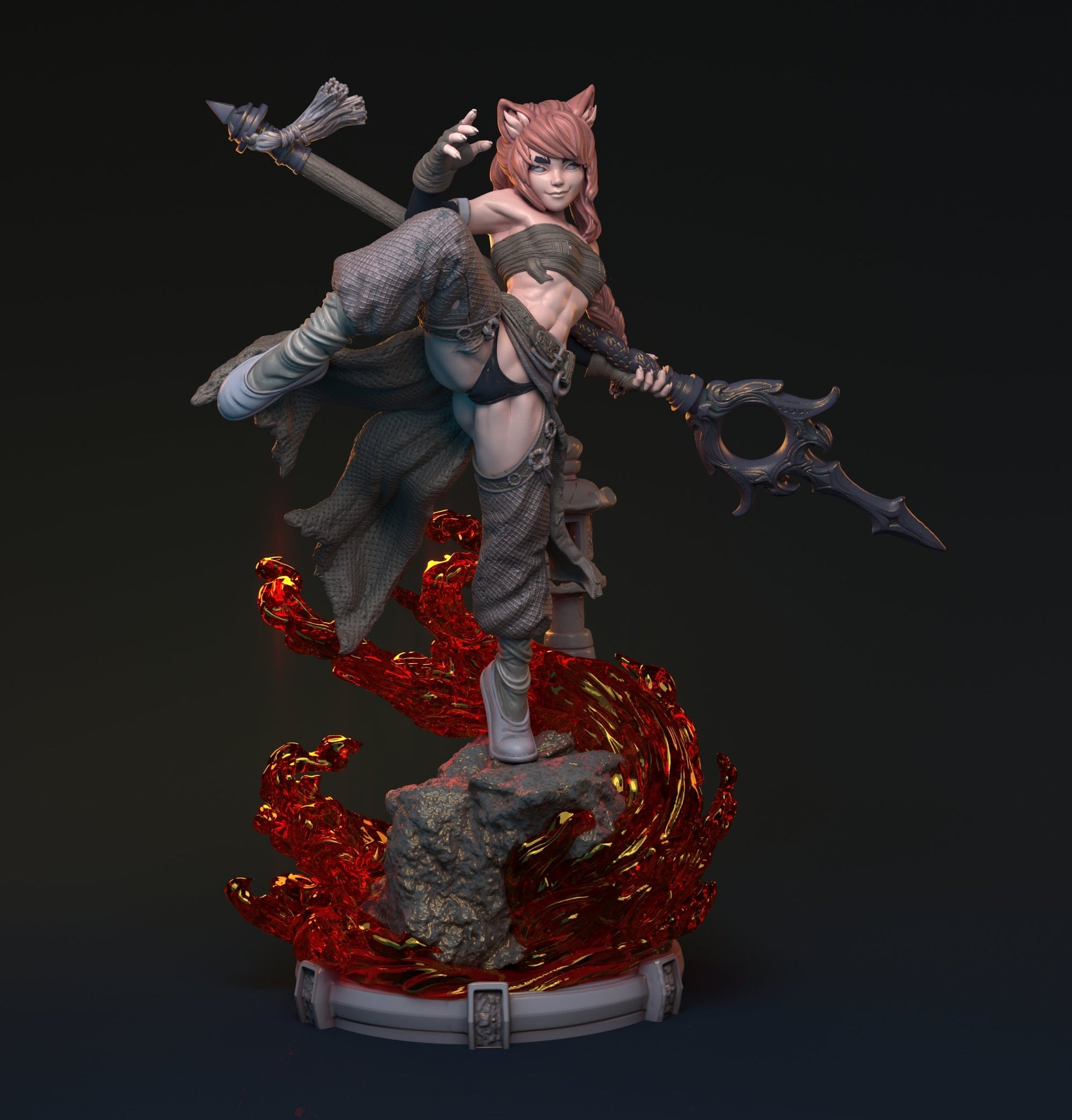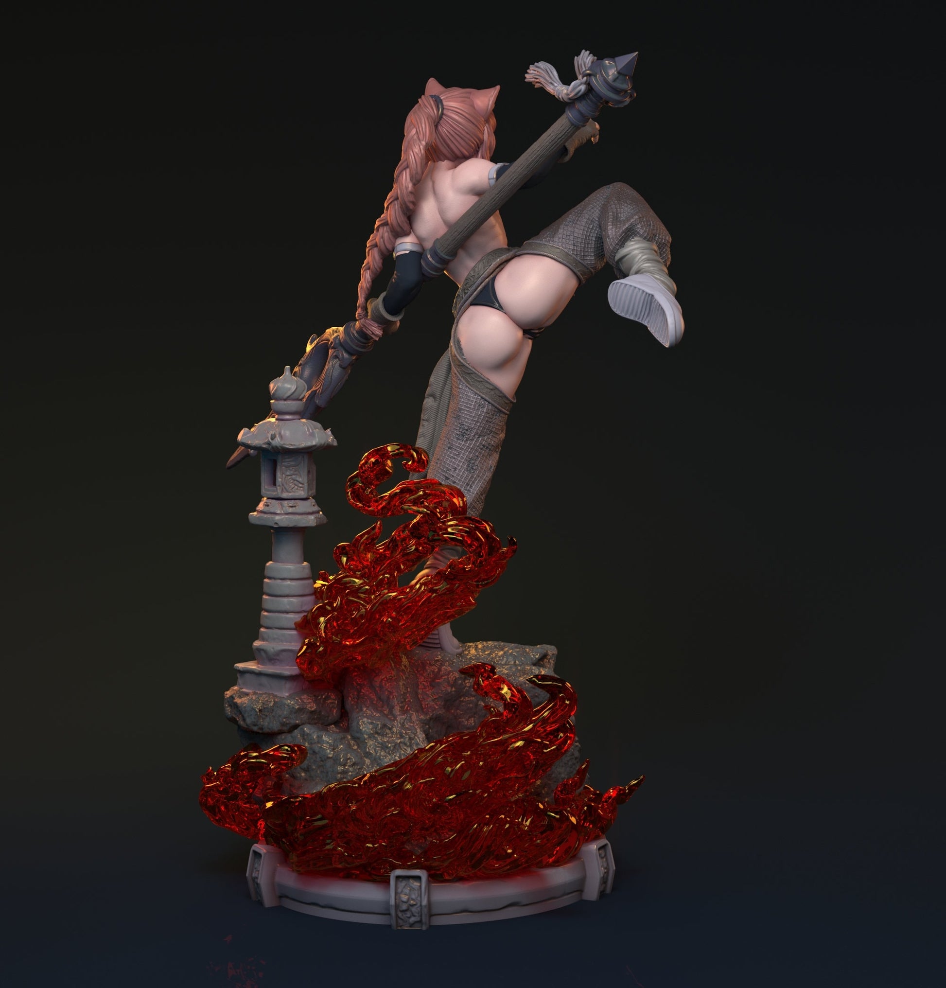 "Half breed of the cat tribe, this woman has taken on the mantle of the yokai Bakeneko. A fierce warrior, Bakeneko is never without a smile on her face even as her glaive dances between the bodies of those who dare challenge her."