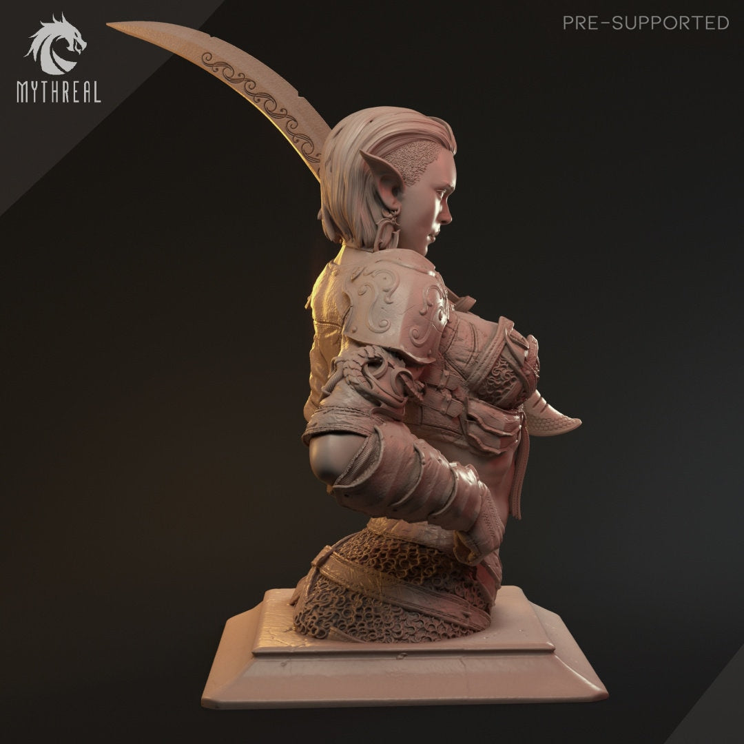 A beautiful large scale bust of Mythreal Games' Hanza miniature. A warrior for the dark elves, Hanza is no stranger to the undeniable allure of a bloody battle.