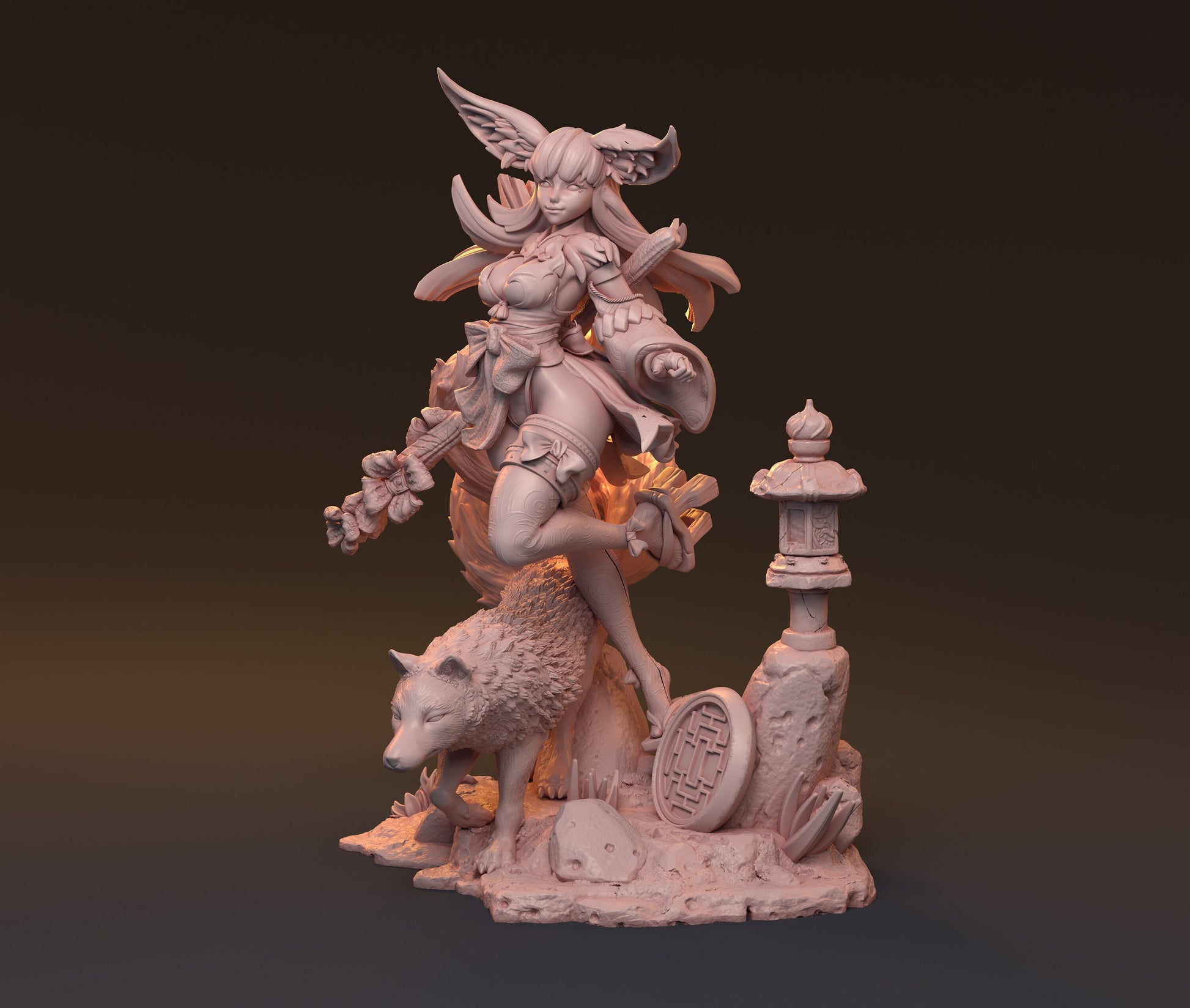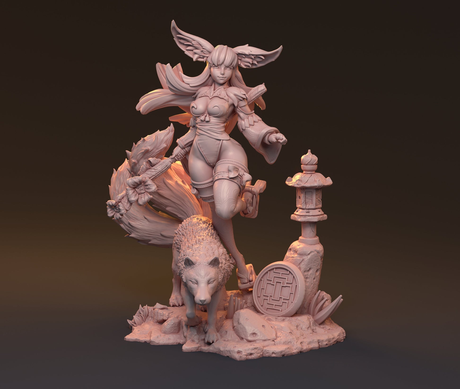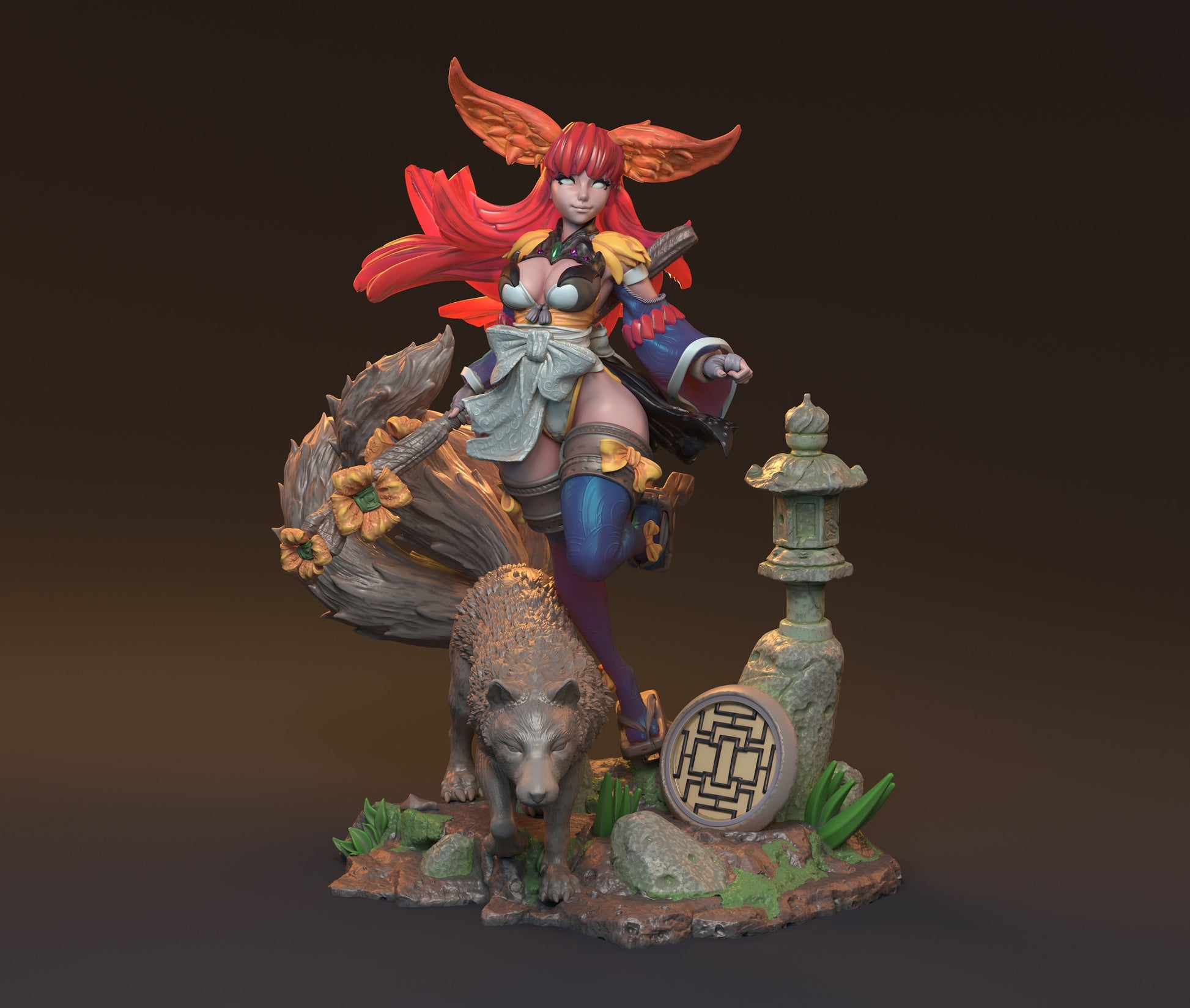 "Nimble and mischevous, Moriko takes on her person as the clans lovable jester. Though her fox-like nature belies a fierce guerilla fighter. Flitting in and out of battle sweeping her stave across those who dared to ruin her fun or bring a frown to her families face."