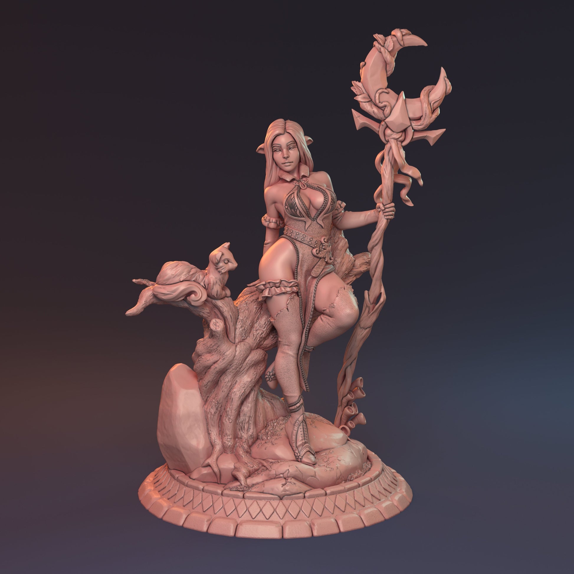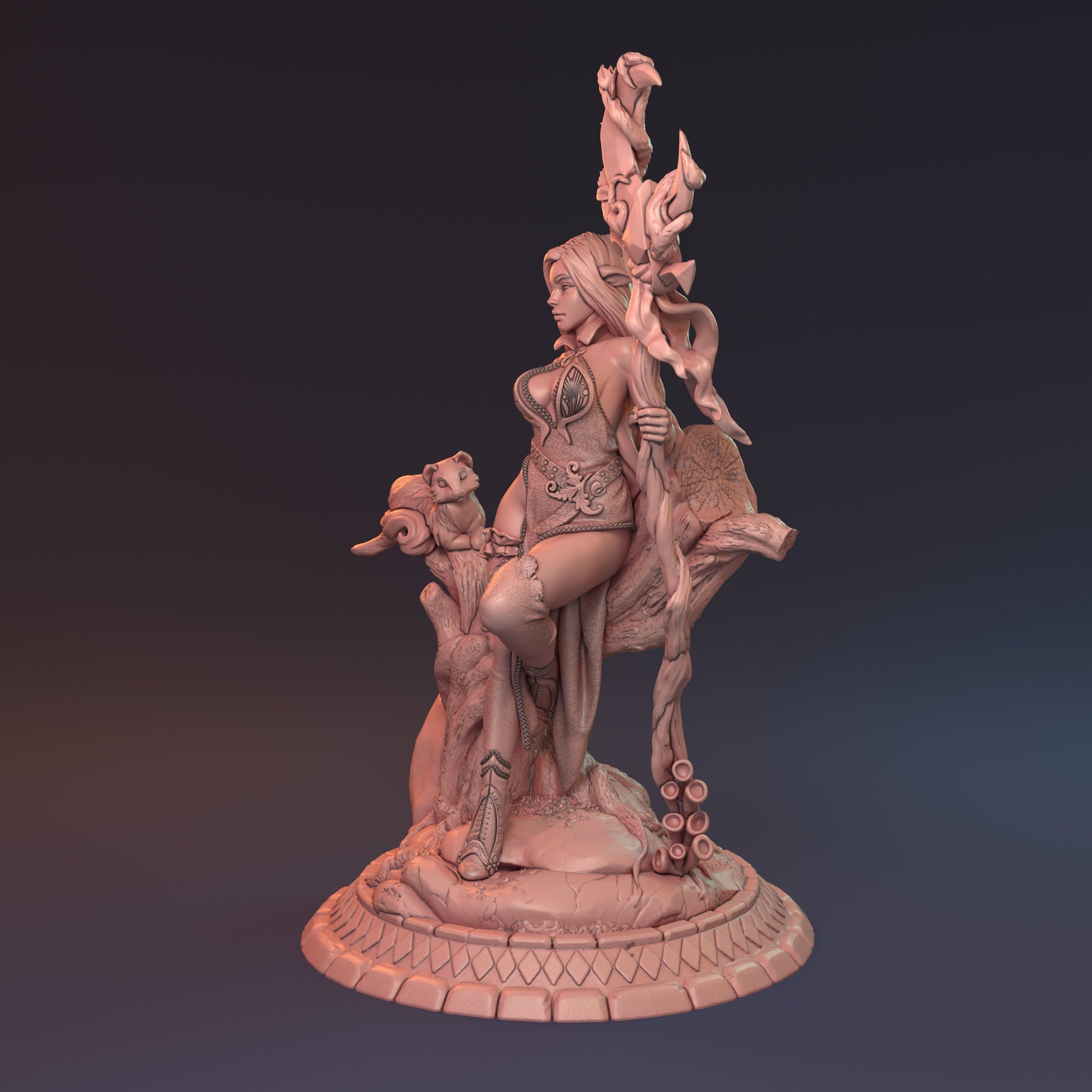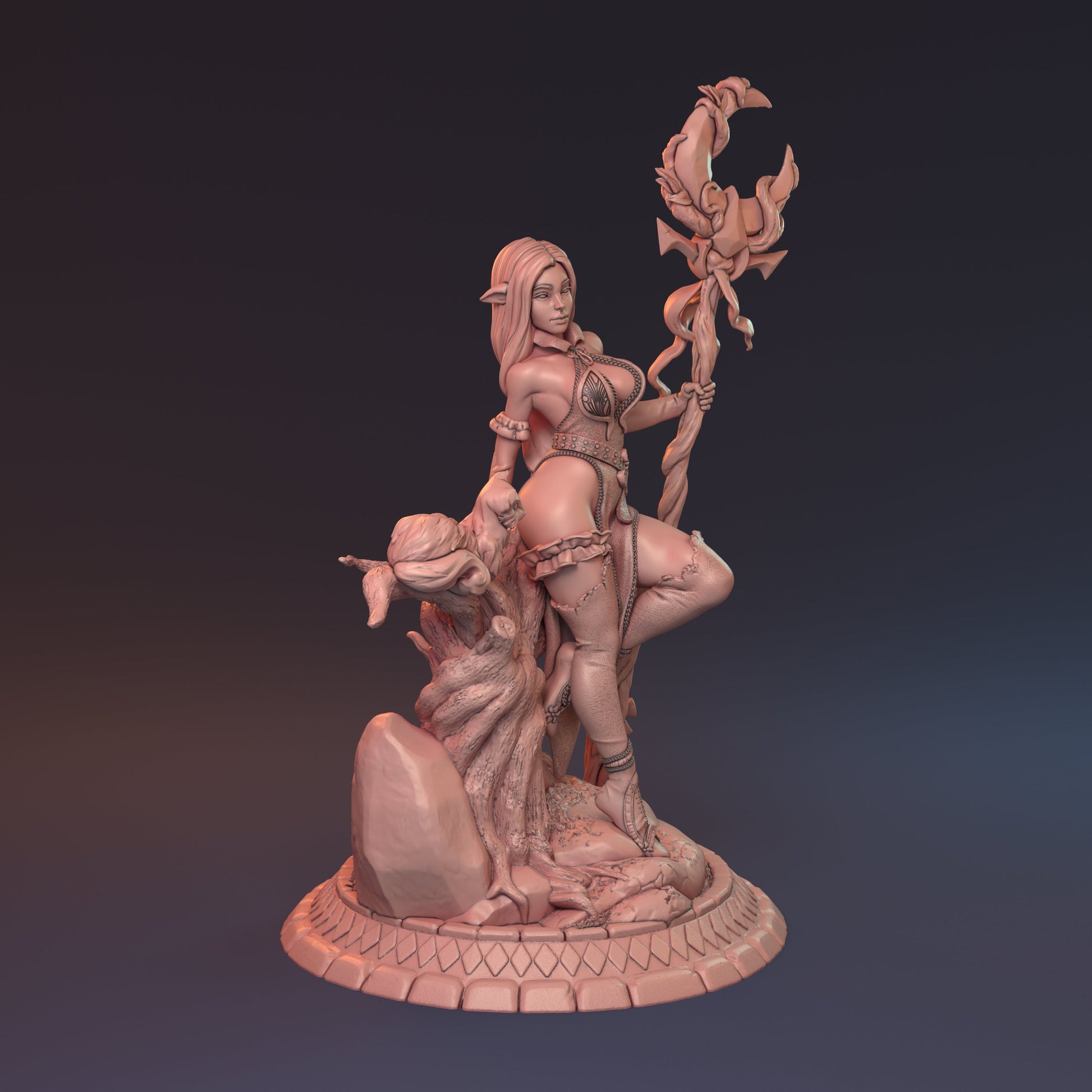 "The woods are laced with magic. It oozes from the blades of grass, dancing like thistles in the wind before disappearing into the clouds to return as rain. Ogasta has long watched the world as it flowed through her forest. A druid, the most holiest type of wizard to the elves for her connection to nature proves the elves very origins as the fruits of the World Tree."