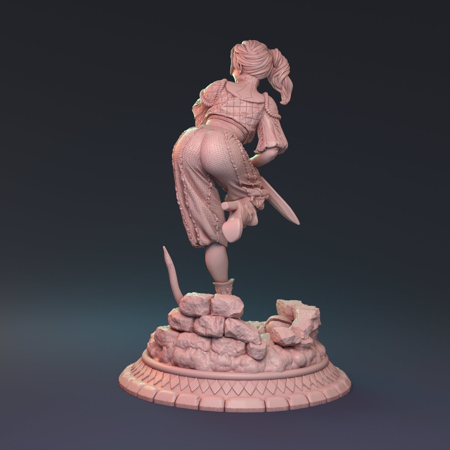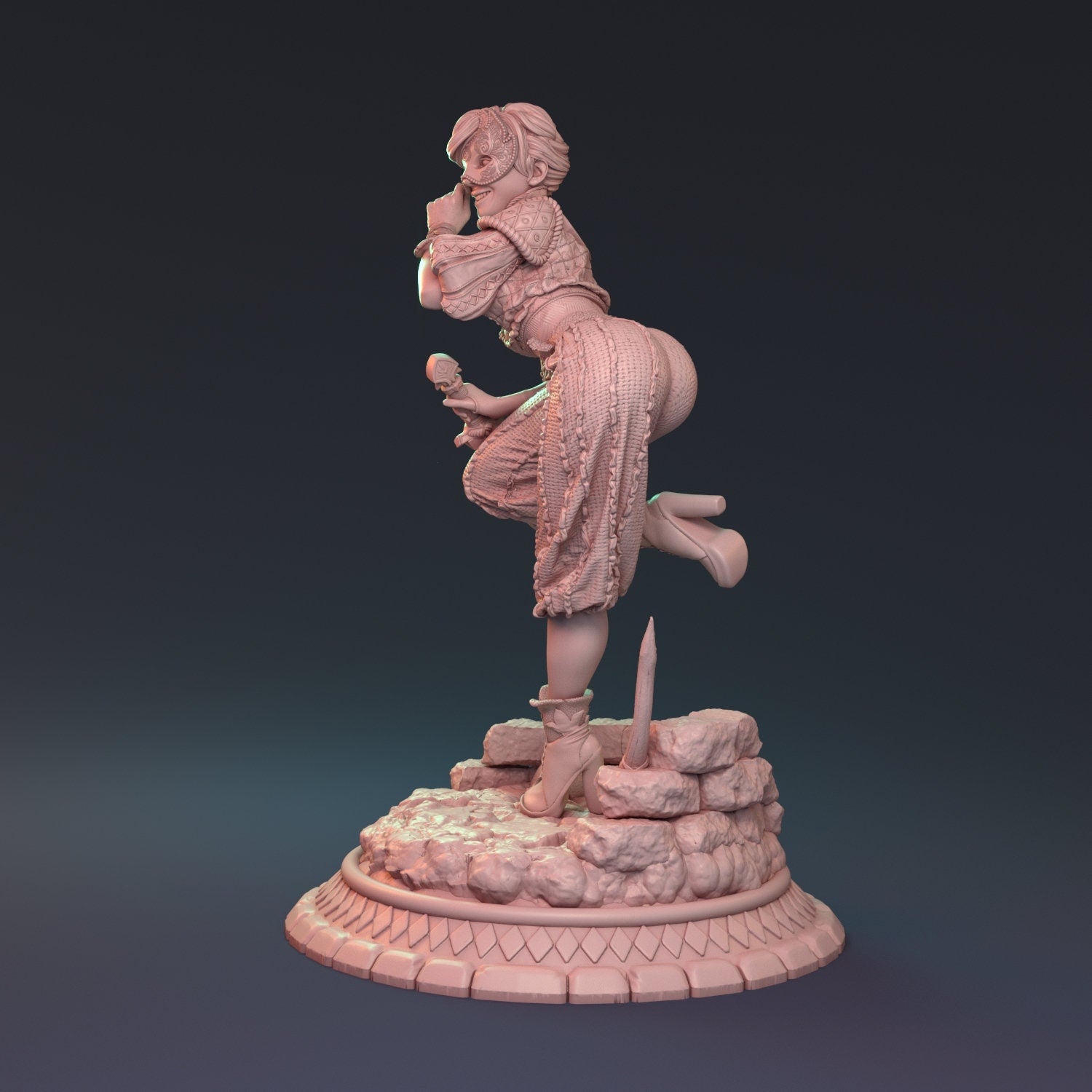 "Bouncy and bountiful, the mischeivous Sibyrith is an ever uplifting presence in Northan-Zaire's inhospitable climate. Though tell her companions this not, for her mischeivity brings an endless exhaustion to those whose days start with powdered explosions and nights with dirt flavoured soup. Still, this spry woman has made a name for herself as a skilled killer with blood enough on her hands to make the most brutal bandit in these lands weep with fear."