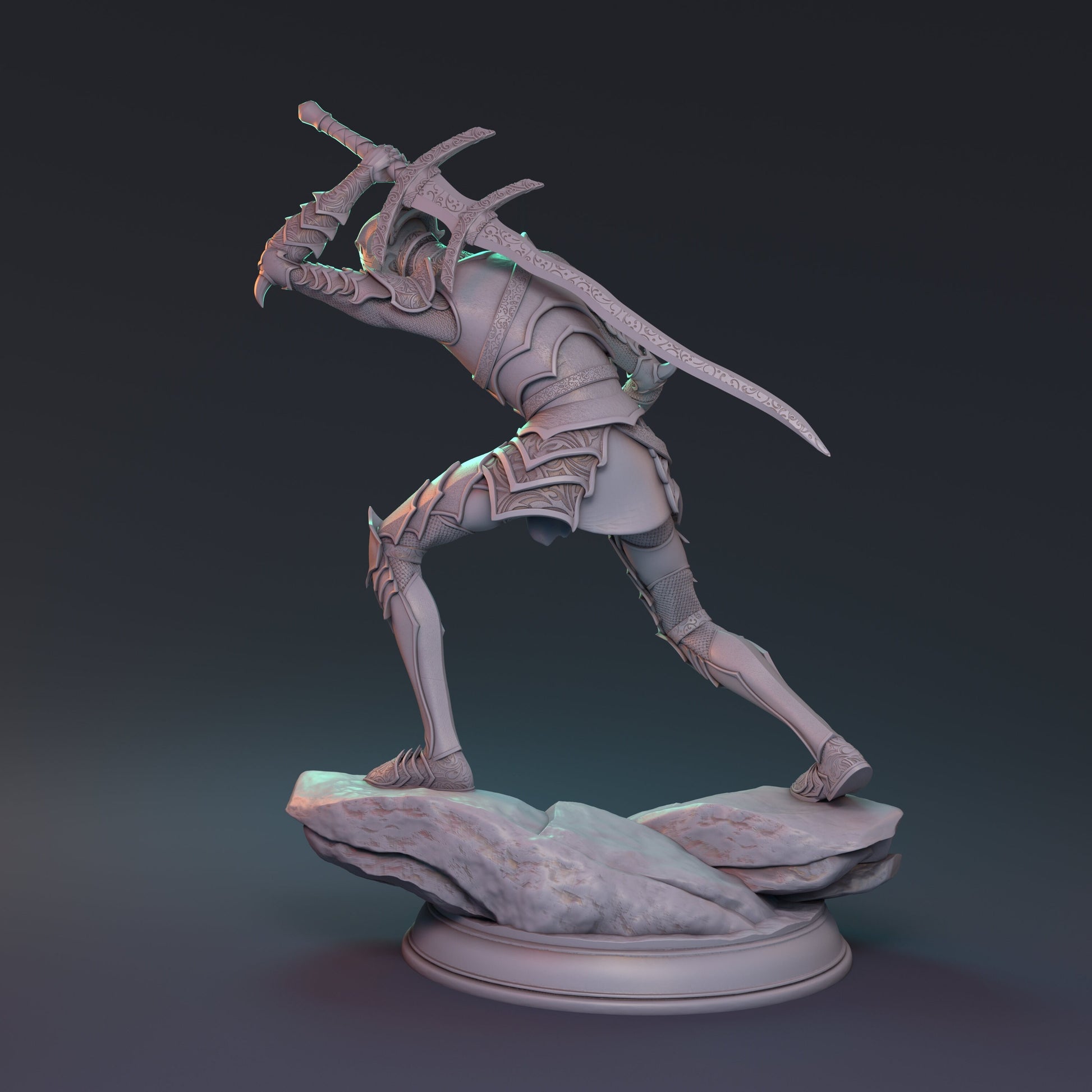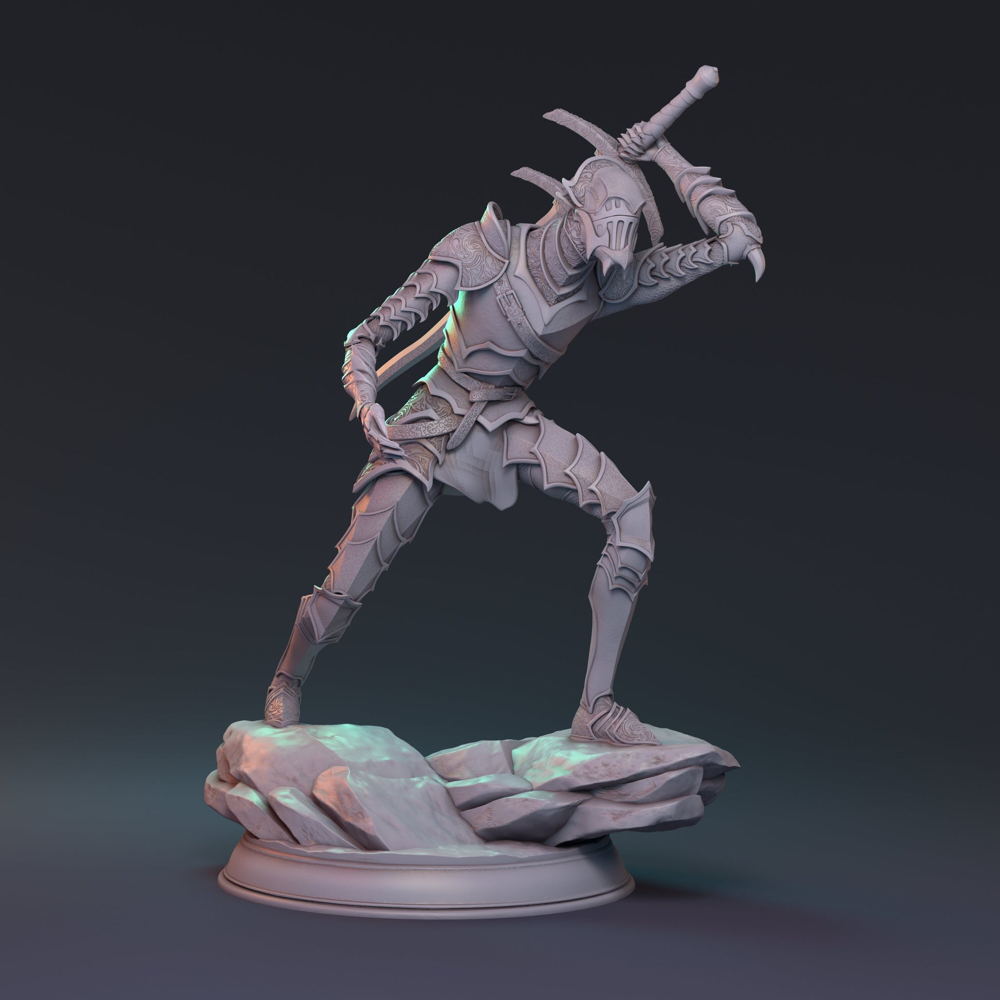 "Sir Azur is a rare sight to see in the city of Angulaya's. Lithe, nimble, and more secretive than the wakes which batter the citie's shores, Sir Azur is a rutheless and loyal executioner for the king. His agility perfect for bounding across the city with great speed and unnerving silence as he scours it clean of whichever unlucky fool has drawn the kings ire."