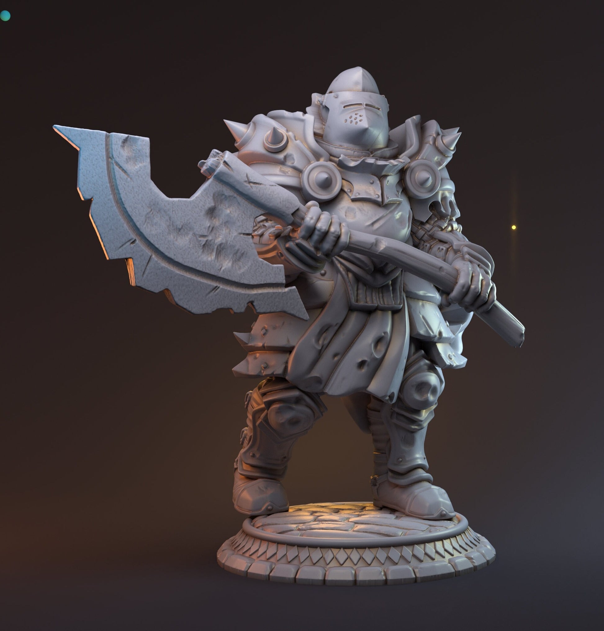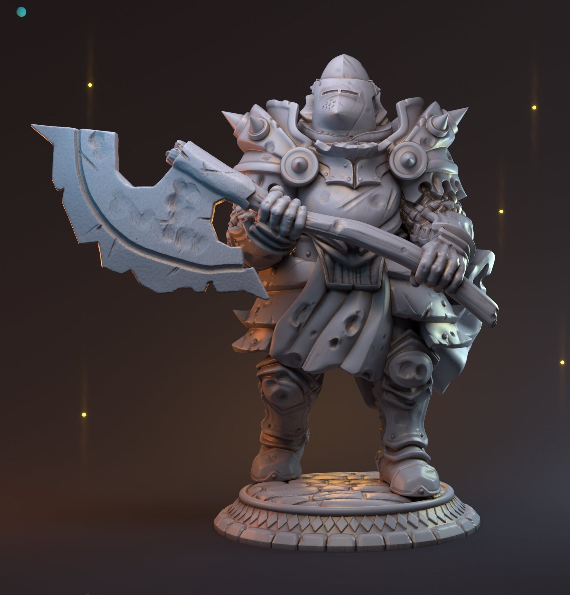 "Slow but powerful, the soldier Sir Radnor lumbers into the field of battle. His axe swinging like a hurricane cleaving head from shoulder and shoulder from body. The blades of his enemies clatter futilely against his armour, leaving them open to a single, deadly cleave."