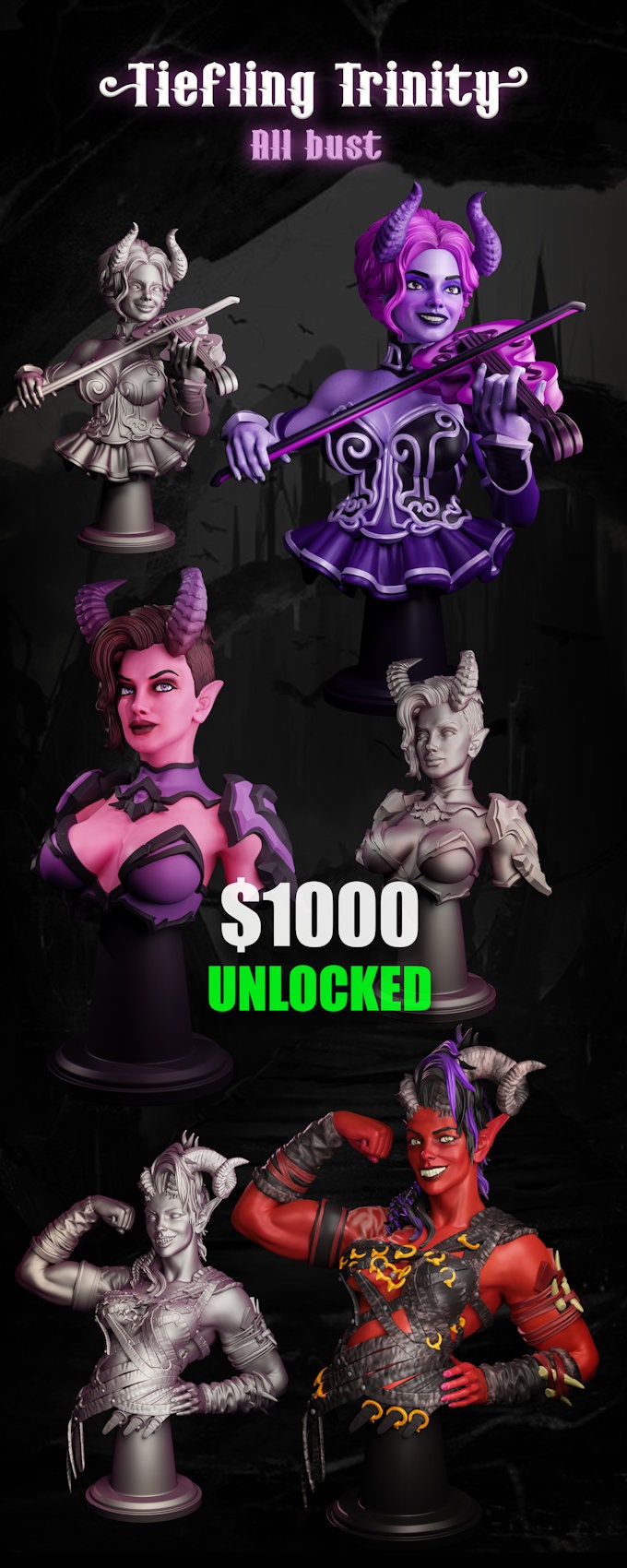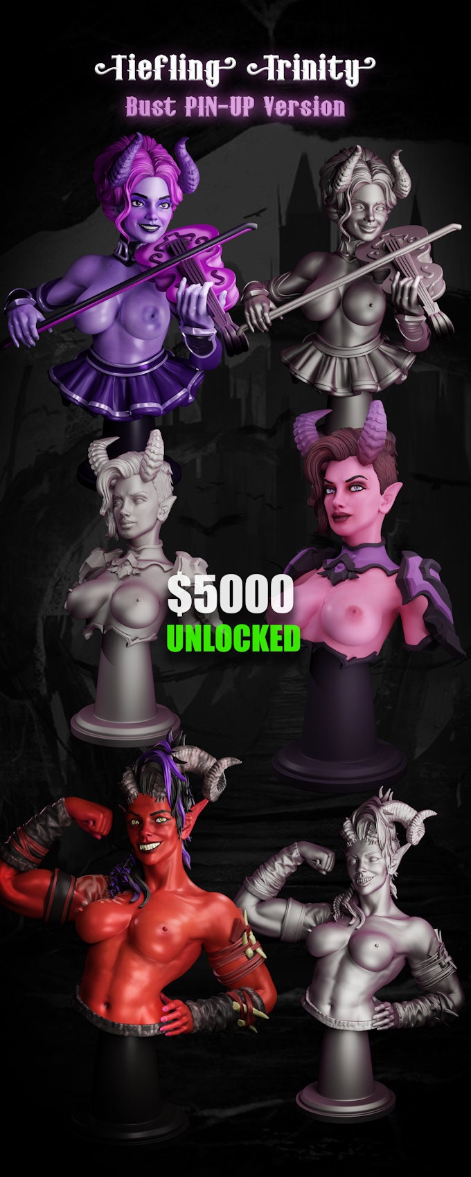These models were sculpted by Jugglers Miniatures and are sold with their licensed permission through the 'Tiefling Trinity' Kickstarter campaign.