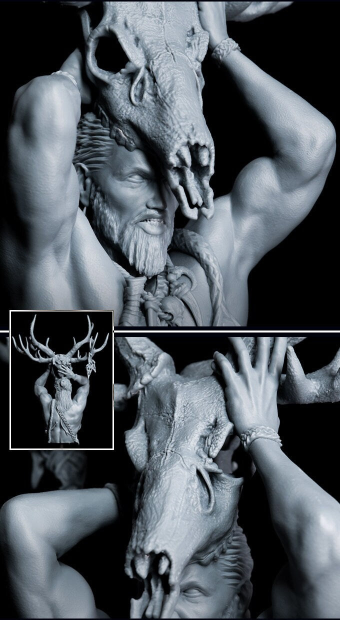 This bust of Wappelious, the Druid, was sculpted by Printomancer. It dipicts him mid ritual, holding aloft above his head, the skull of an enchanted beast. With it he claims knowledge of the unknown.